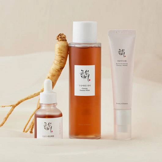 مجموعة روتين الجينسنغ من بيوتي أوف جوسيون. تجمع هذه المجموعة بين قوة المكونات الكورية التقليدية وعلم العناية بالبشرة الحديث لتقديم روتين شامل للعناية بالبشرة. تحتوي المجموعة على ثلاثة منتجات استثنائية: ماء الجوهر بالجينسنغ، سيروم الإنعاش، وسيروم العين المنعش. كل منتج مُصمم لتحسين مظهر بشرتك بشكل عام من خلال الترطيب، مكافحة علامات الشيخوخة، وتعزيز تجديد الخلايا.