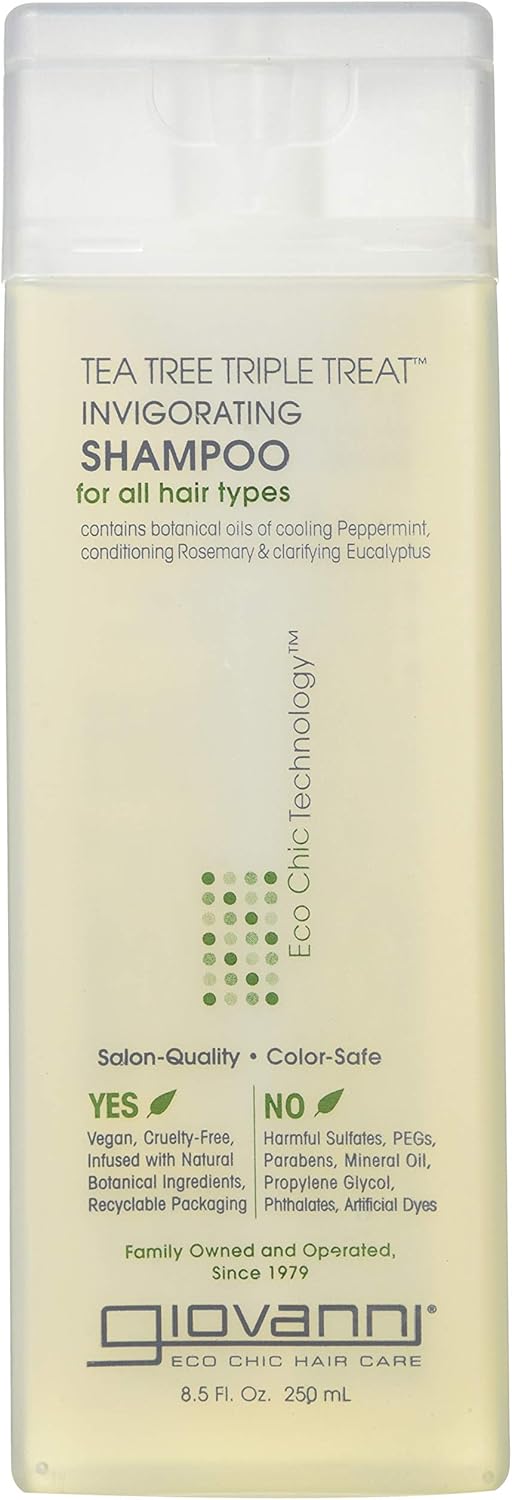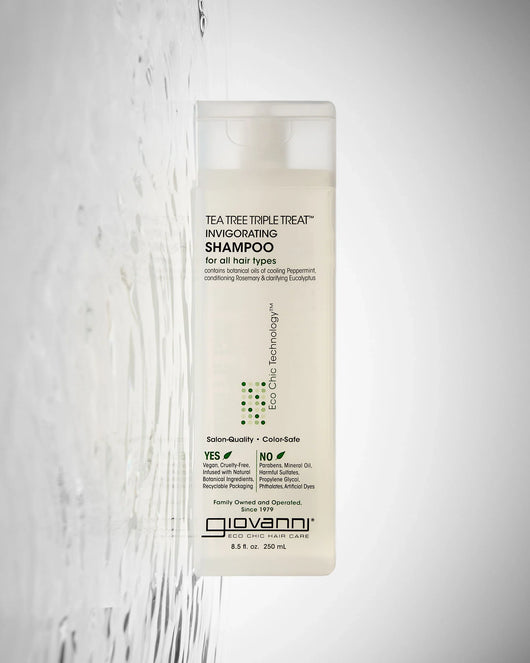 اكتشفي تجربة تنظيف وانتعاش مثالية مع شامبو تي تري تريبل تريت من جيوفاني، الذي يجمع بين قوة المكونات النباتية وتقنية Eco Chic لتمنحكِ فروة رأس نظيفة ومنتعشة وصحية وشعراً أكثر حيوية ونعومة ولمعاناً طبيعياً. مع كل غسلة، ستحصلين على إحساس دائم بالانتعاش والنظافة يعكس جمال شعركِ وصحته.